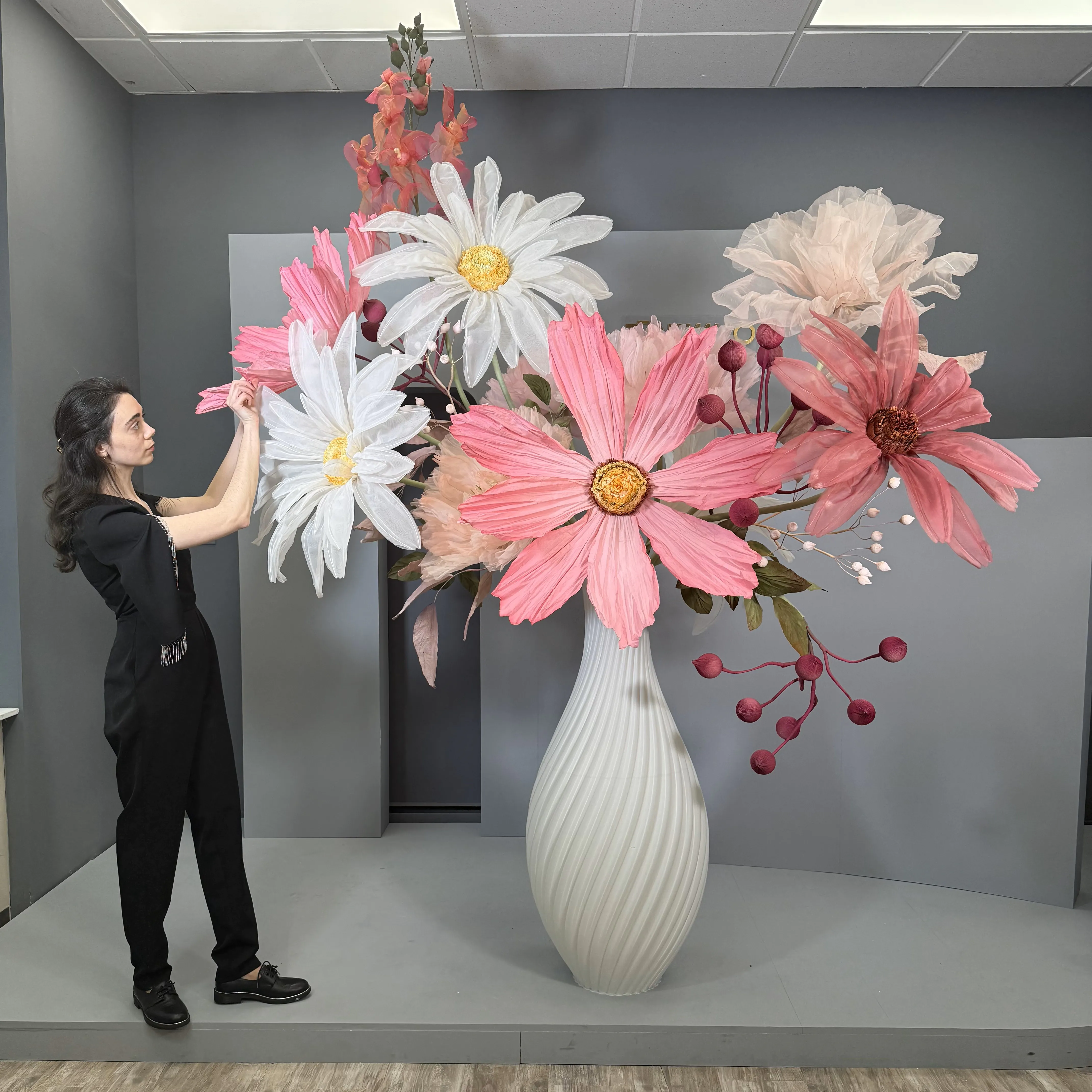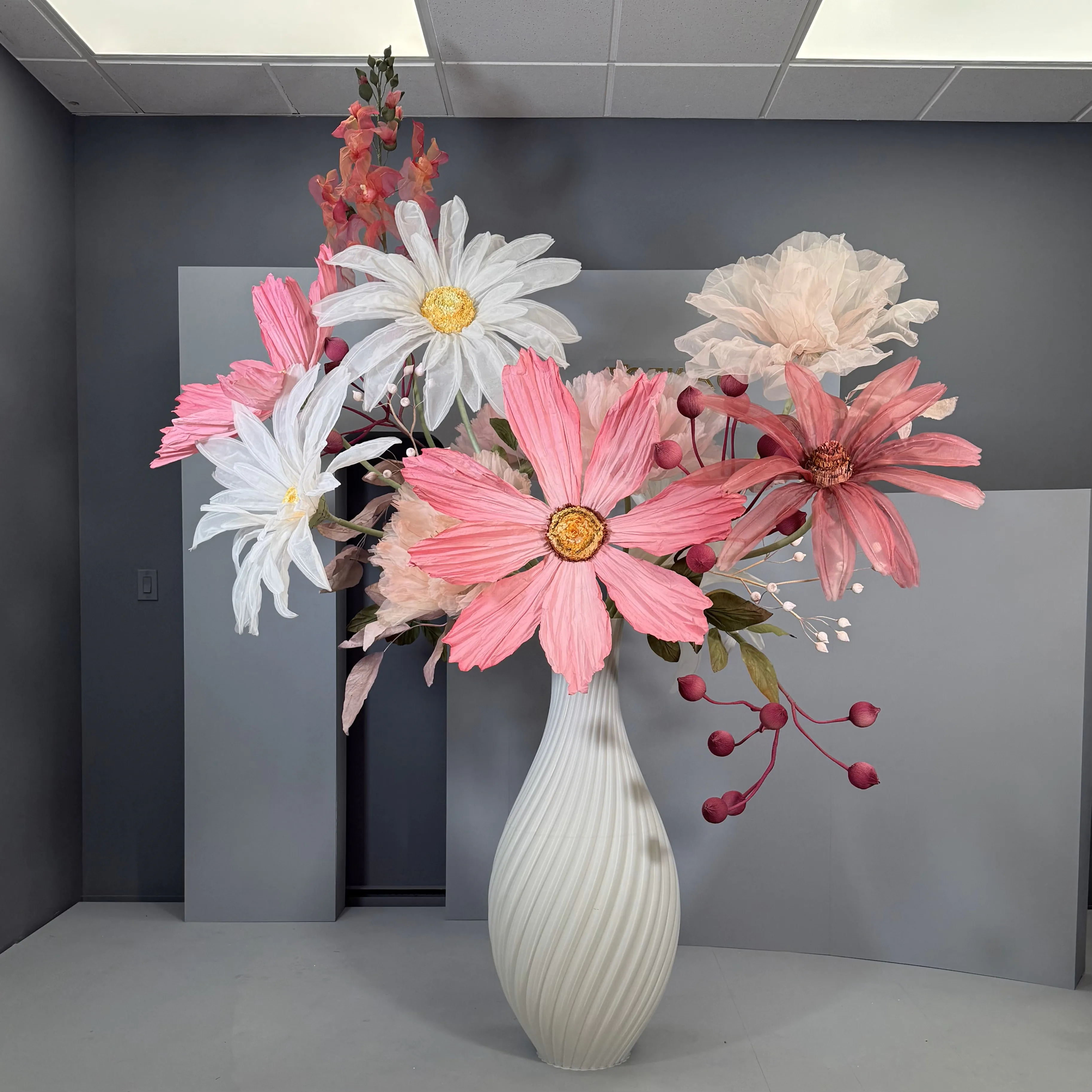 This stunning floral arrangement is a captivating fusion of art and nature, featuring oversized sculptural flowers in soft pinks, whites, and deep magentas. Delicate petals of cosmos and daisies extend gracefully from an elegant, textured vase, creating a sense of movement and lightness. Accentuated with lush greenery and whimsical berry-like details, the composition feels both organic and fantastical. This piece exudes sophistication, making it a perfect statement for events, window displays, or interior décor that demands attention and admiration.